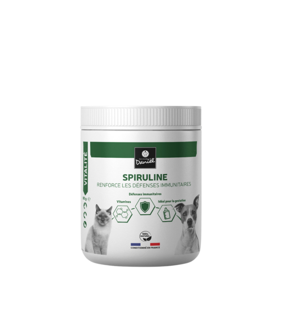 La SPIRULINE sous forme de poudre, cette micro algue de couleur bleue/verte, est un complément alimentaire composé de minéraux et d'oligo-éléments (magnésium, fer, manganèse, etc.), présents en nombre. Elle permet la stimulation du système immunitaire qui est essentielle pour les chiens et chats âgés ou encore pour les femelles gestantes et/ou allaitantes.
